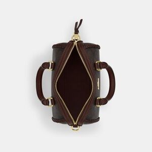 Signature coated canvas and smooth leather Two credit card slots Zip-top closure fabric lining Handles with 2 3/4 drop Detachable strap with 23 1/2 drop for shoulder or crossbody wear 7 (L) x 4 3/4 (H) x 4 (W) Style No. CCF30