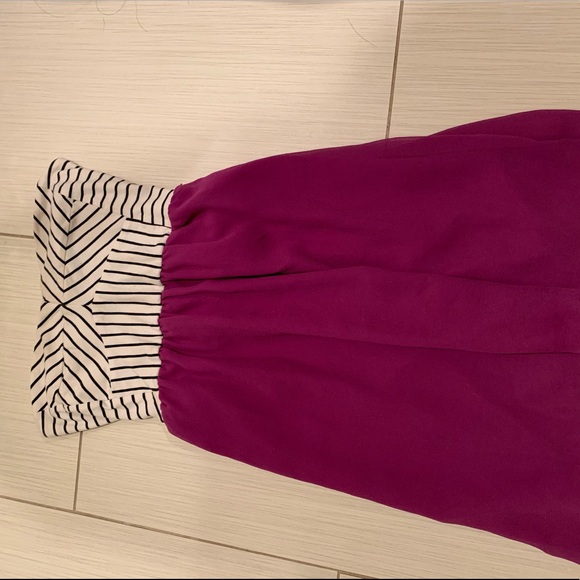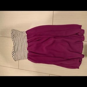 Strapless short Roxy dress, purple flowy skirt with stripped white wrap top, really short