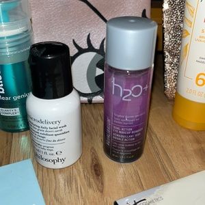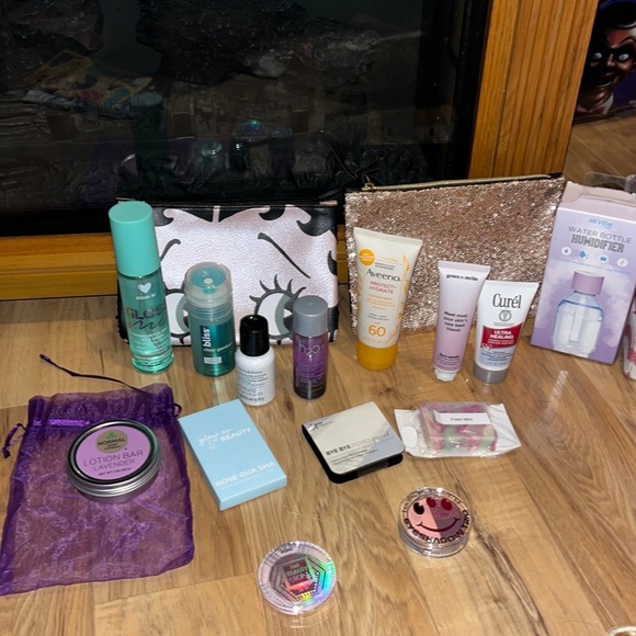Mini Sampler Bundle. Two makeup bags. Water bottle humidifier.Lavender lotion soap. Beauty bar, bye bye pores sample. Fresh mint homemade mini soap. Mini curel ultra healing lotion. Grace & stella mud. Aveeno mini sunblock. H20 mini makeup remover. Philosophy mini facial wash. Bliss mini clear genius toner serum. Gloss me cannabis sativa seed oil hair serum. And a new Makeup carrying bag. All brand new samples. Cross posted.