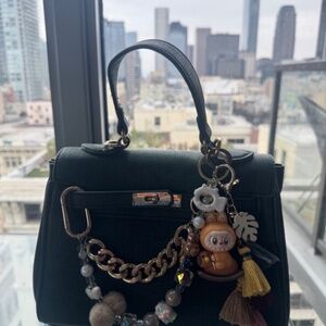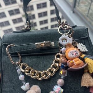 This stylish little satchel bag is classy and cute at the same time! The bag is a textured cloth with gold hardware. It comes with a detachable purse strap for a crossover look, when needed. Dark green + 1 gold chain, 1 gold clasps and 3 custom charms (will include the Labubu charm). Bag being sold is the one pictured!