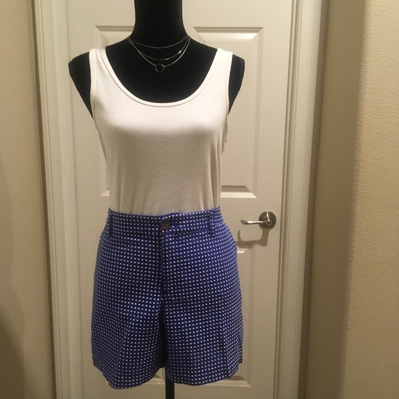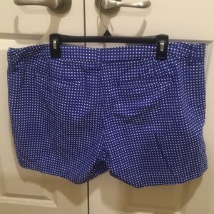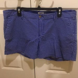 Navy / white polka dot shorts, cotton/polyester blend two front & two back pockets, length 15”, waist 21” across, Inseam 5”.