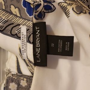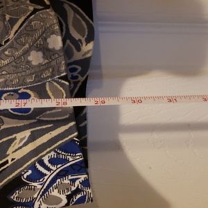 This is a Cotton/Spandex blend. Base color is white with blue, black, and grey designs. Gently worn with no signs of wear.