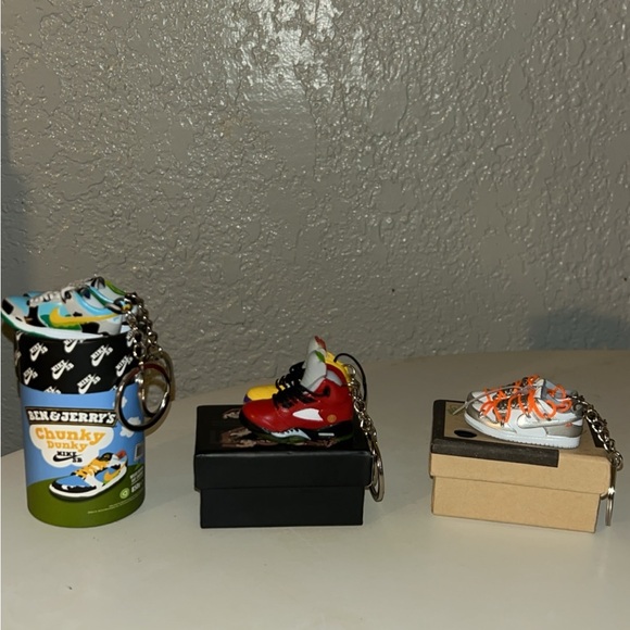 Set of mini sneaker keychains with vibrant designs. Includes red and multicolor sneakers. Perfect for sneaker enthusiasts.