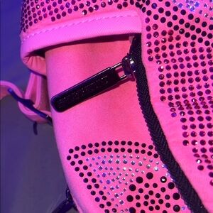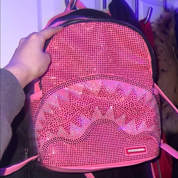 The Sprayground Pink Backpack is a stunning accessory, featuring a vibrant pink hue embellished with sparkling rhinestones. Its unique design and reflective material make it a perfect choice for those looking to add a touch of glamour to their style. This backpack is both fashionable and functional, ideal for making a bold statement.