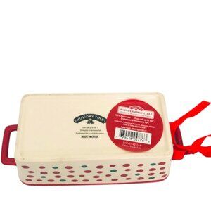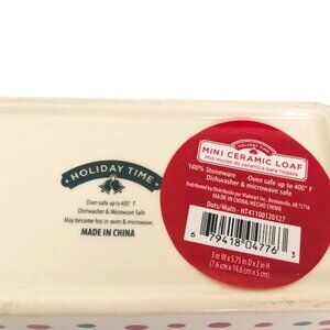 It is ceramic and is red and white striped with a green exterior. Microwave & Dishwasher safe. 6 ½” long x 3 ½” w x 2 ½” deep