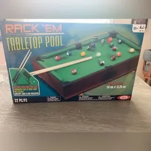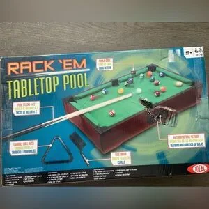 Compact tabletop pool game with colorful balls and cues. Perfect for fun and entertainment. All items included brand new, box slightly damaged.