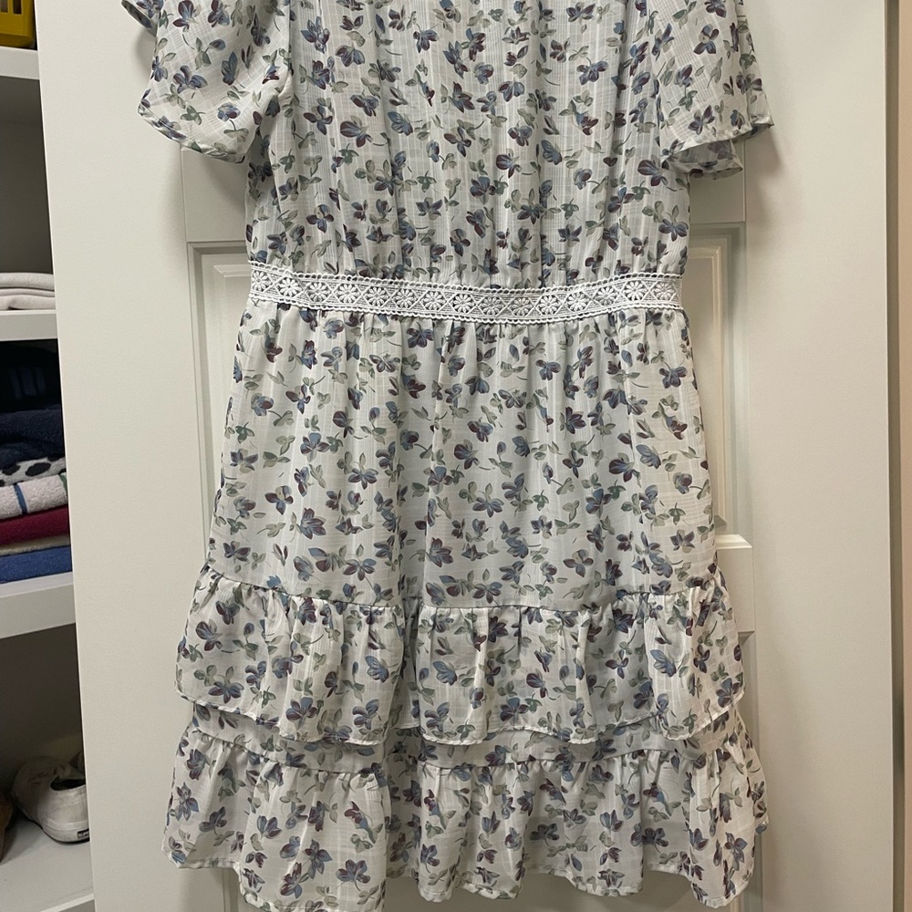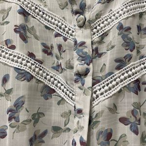Ruffle bottom Flutter sleeve Sheer in back Button up Fits like a small