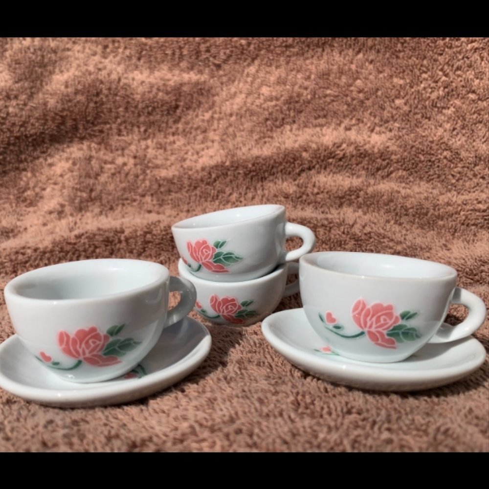 This is a vintage looking children's mini tea set, each piece has a painted on rose and is made of porcelain. These have rarely been used