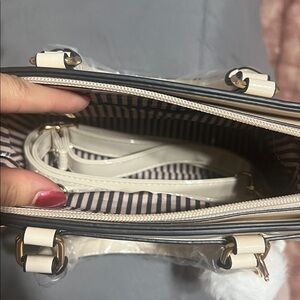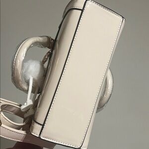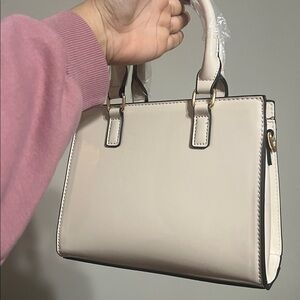 Mini vegan patent tote bag. Boutique item, brand new still wrapped. Comes with crossbody strap. Charm included. Off white color.