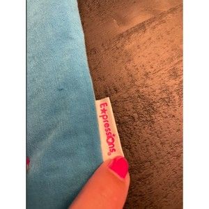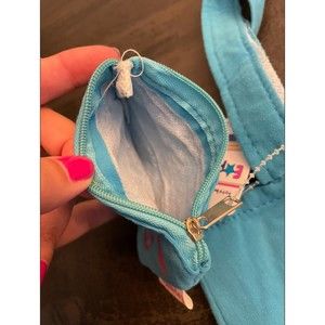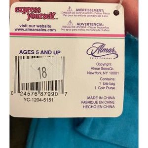 Very cute! With little matching pouch. Glitter and embroidery on this small tote bag. The inside is lined with a sort of nylon like material, good for any spills. See pics for measurements.