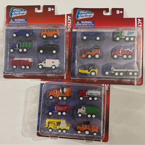 Price is for all 3 sets. These mini vehicles are perfect for everything from on-the-go play to cake toppers.