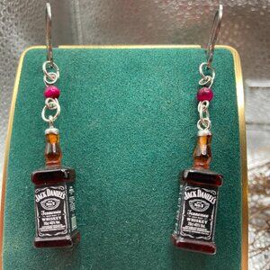 Stainless steel earring hooks. The earrings contain mini Jack Daniels whiskey bottles and pink tigers eye beads.
