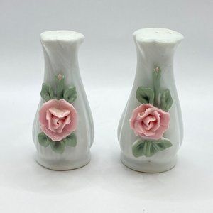 Mini White Porcelain Rose Leaf Salt and Pepper Shaker Set Pink Applied Floral 3"