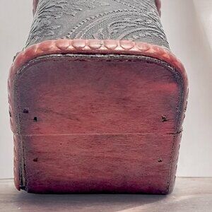 This beautifully renovated small antique style jewelry box is made of wood, and adorned with elegant copper color florals, Its rectangular design evokes a sense of timeless charm, while the curved metal catch ensures your items are safely stored within.