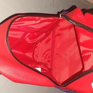 I bought this adorable bag for a trip we were gunna go on but unfortunately never went. so it is new with out tags. it is red and blue has 2 zippered pockets. and long adjustable straps. comes with coin matching coin purse.