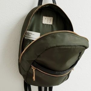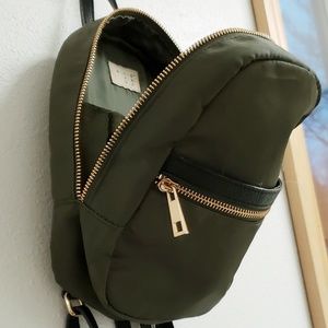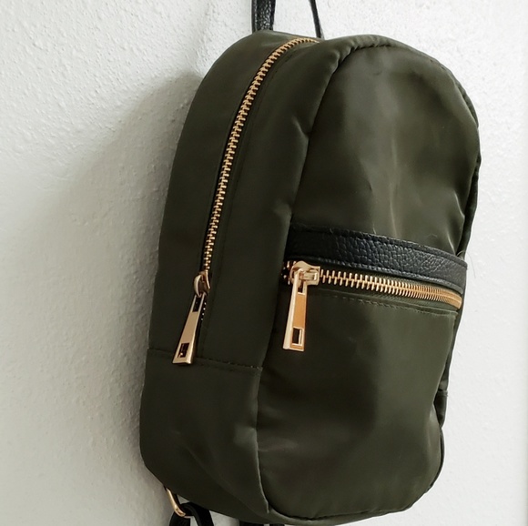 Army green mini backpack with gold zippers and black leather straps. Two front pockets one opened, one zips shut.