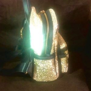 Bella Paulla gold all sheer sequin mini back pack with pack buttons.