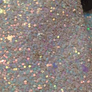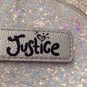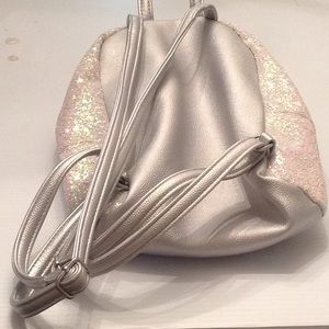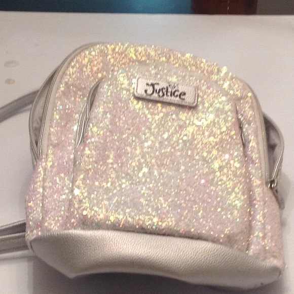 Preowned Justice mini backpack...silver sequined/sparkly with silver straps..some staining on inside of backpack due to wear but outside looks good...