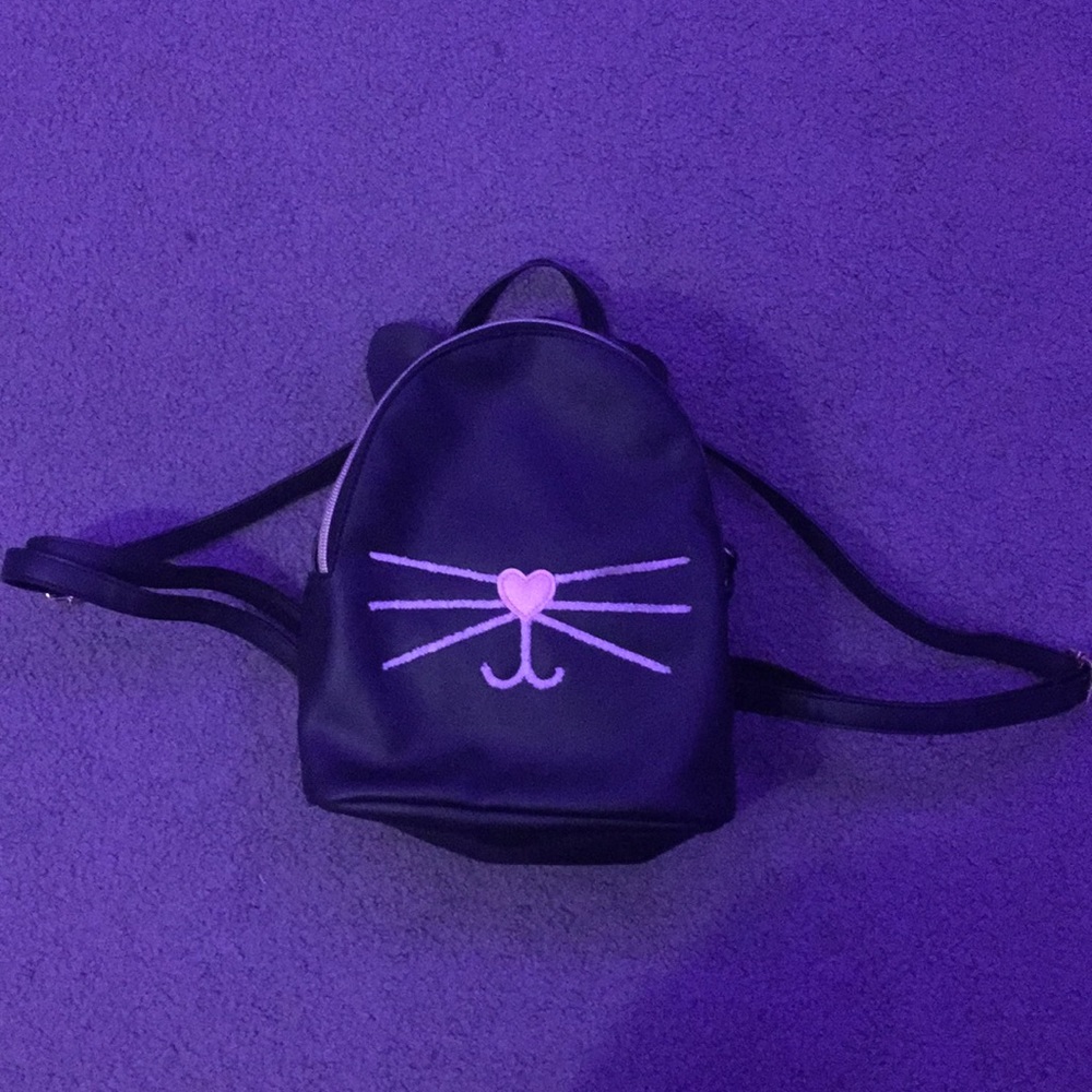Black mini backpack with pink cat nose and whiskers and ears. Gold zipper and adjustable straps. Zipper and pocket inside as well