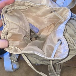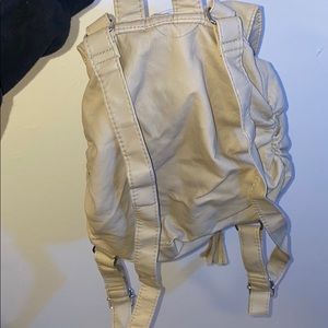 Cream colored leather backpack with tassels. It also has adjustable straps.