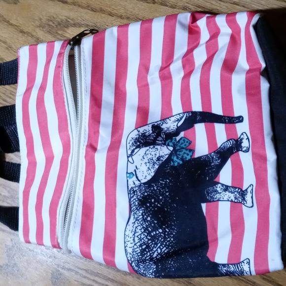 One large pocket, mini backpack with elephant design on front. Super cute! Please ask for measurements!