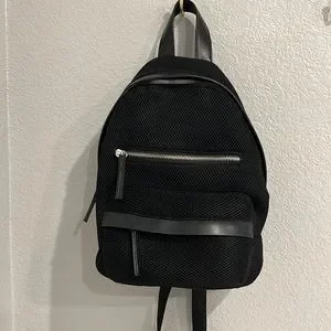 Mini black backpack. Mesh material on the outside but not see through. About 9” x 12”. EUC.