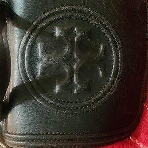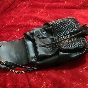 Pre-owned Tory Burch black backpack. It has lots of packets and presents signs of wearing but has no tears or stains other than some peeling on corners at the back and on adjusting cords which do not work well.