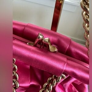 Excellent used condition - please see photos for current condition of bag Purchased from Neiman Marcus Gorgeous pink satin fabric and gold hardware Red lining Included dust bag Estimated item measurements: Width: 75" Height: 6" Handle Drop: 5" Depth: 2"
