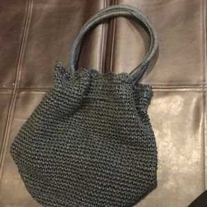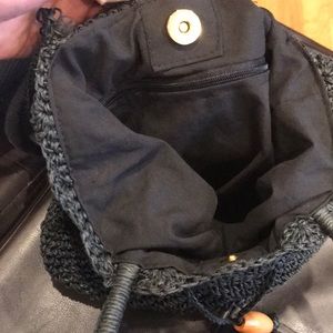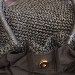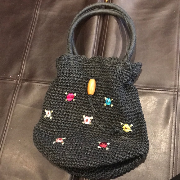 Adorable bag with drawstring and snap closure. Has a small zipper pocket inside. ( see last pic- seam has opened a tiny bit) Otherwise in great condition.