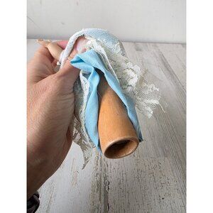 about 8 in tall by 6 in by 2 in, mild wear overall, does have some paint wear, looks to be a mini tree topper but stands on its own, could be used as a figurine as well