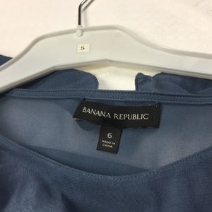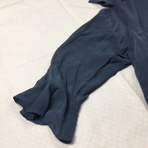 Blueish grey ruffled above knee dress. Pull over no zippers or closures.