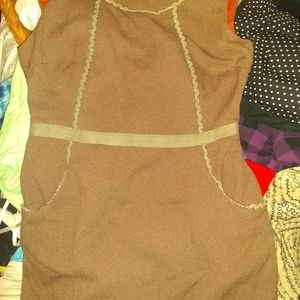 Brown with green piping and pockets fully lined side zipper deep v in back small amount of pilling could prob be trimmed this dress is the best