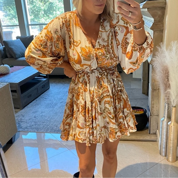 Cream dress with orange paisley details and braided tie waist. Worn once for photos.