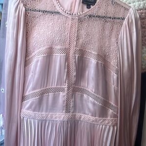 Bardot Olivia mini dress with pleated skirt, long sleeve with elastic hem, crochet accent at top, and zip closure at back.