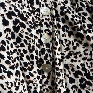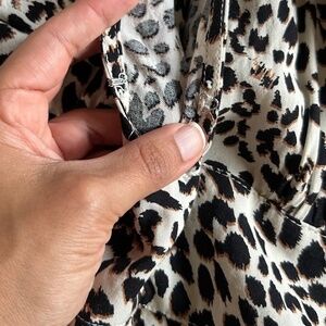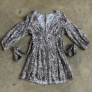 Mini dress with cheetah / leopard print. Iridescent buttons, zip closure in the back, ties that can go in the front or back to accentuate the waist, the skirt part is lined. It's low cut but it has a hook notch (see 3rd pic) to give a little extra coverage and security if you want. 100% Rayon. Brand is Cotton Candy LA, bought at a boutique in Miami.