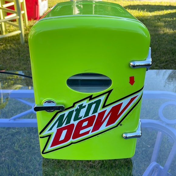 For sale is a Mountain Dew mini fridge, bought a while ago and only used once, hold three can drinks and plugs into your cigarette outlet in your car