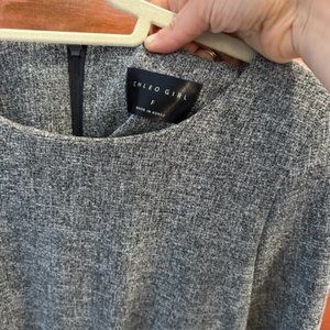 Short grey dress with a soft suit-like material. Great for work - would look cute with black tights or leather/suede boots. Perfect condition. Lightweight. 3/4 sleeves.