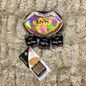 In this makeup bundle there’s a nyx makeup bag, 3 nyx shadows, and a wet n wild glitter in the shade “brass”!