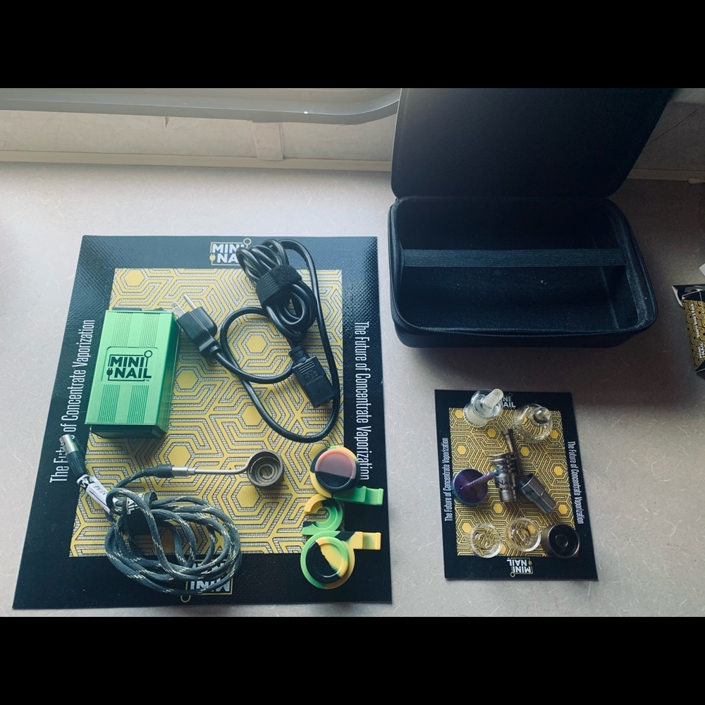 I have a Mini nail with the hybrid nail. Also lots of accessories to come with it. 2 glass dishes if you want to change the titanium one out. Cyclone carb cap, rainbow flat tip dabber cap, 10mm to 14mm glass adapter, 2 pucks, a extra large and small slab pad and a carrying case to store it all in. Recently moved into an RV and have no room to have it set up all the time so I haven’t used it in a bit. I loved this little machine and it still works great! $400 value asking $280 OBO. Lmk if you have any questions