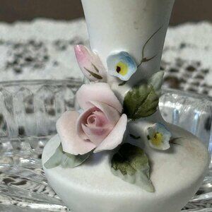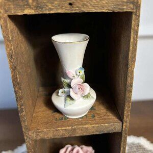 No chips on this stunning little 2-1/4” tall mini bud vase. The bisque pink rose is exquisite with no chips. No maker’s mark, but similar to Lefton, this one is marked 1521 with a Made in Japan sticker.