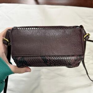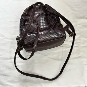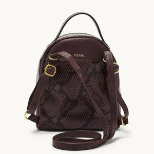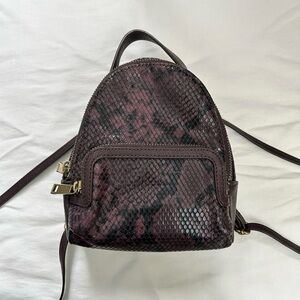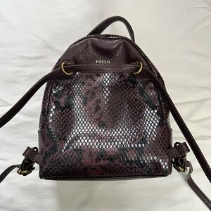 Fossil Maisie Mini Backpack purple faux snakeskin bag purse. Straps are adjustable where you can turn the bag into a crossbody if you want. Some staining on inside pocket (see picture). All zippers functional.