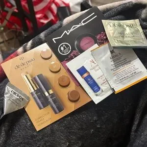Mini random samples bundle includes Cle de peau concealor sample, Mac eyeshadow sample, Augustinus Vader rich cream moisturizer, khiels line reducing vitamin c eye serum sample,Lancome absolue the serum sample and Prada augmented skin cream sample all brand new never used