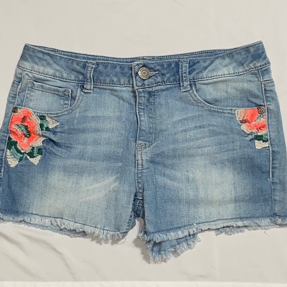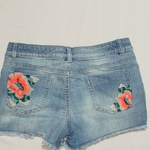 flower embroidery in the corners of the shorts, on the front and back,very youthful