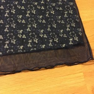 Dark blue floral mini skirt with netting. Beautiful and elegant, can be dressed up or down! 17in long and elastic waist is 11in across.