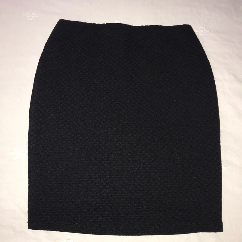 Black tight mini skirt. It goes go right above my knee and is form fitting, has a slip attached
