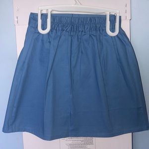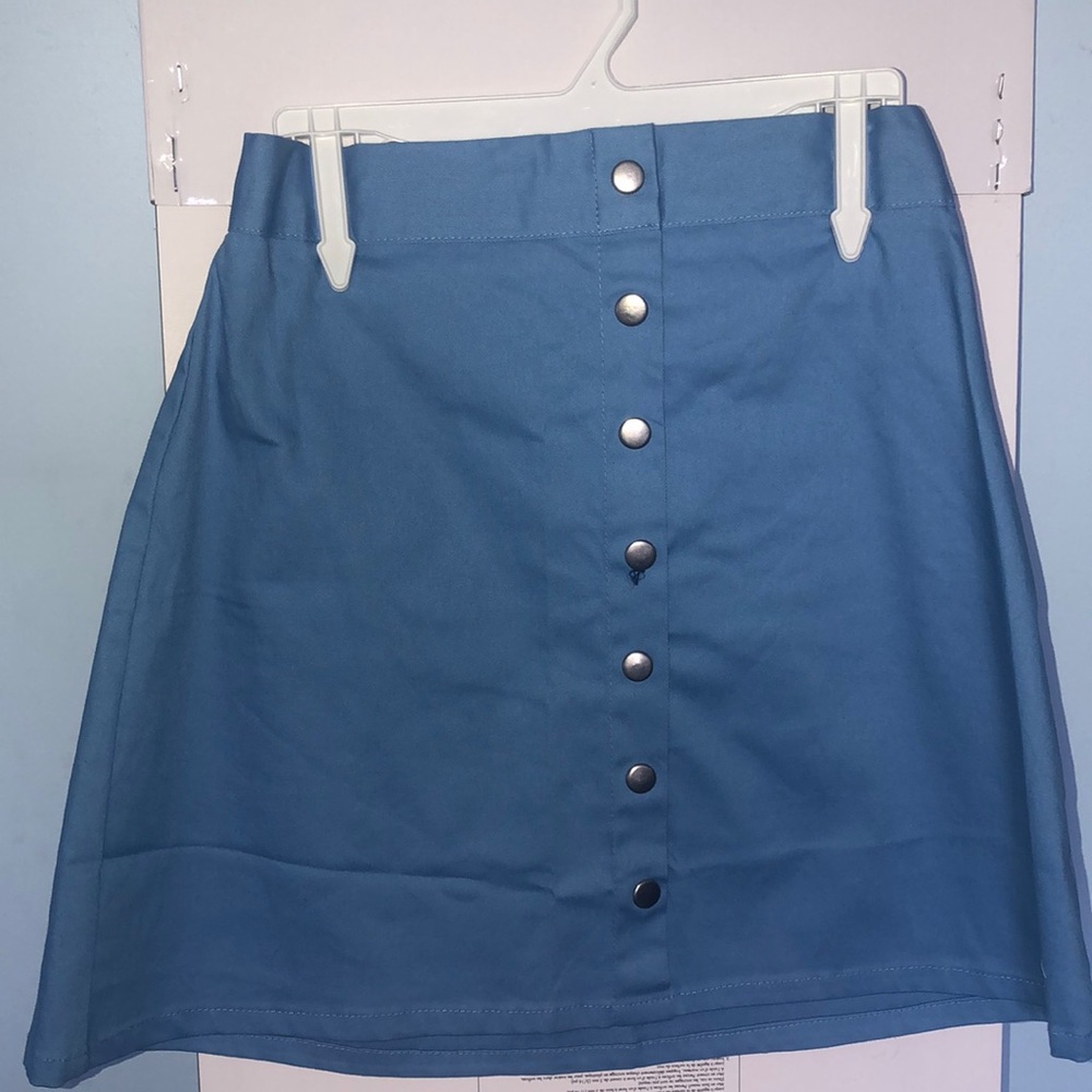 Light blue, Metal buttons down the front, cinched waist, zipper on the side of the skirt, tag is still on