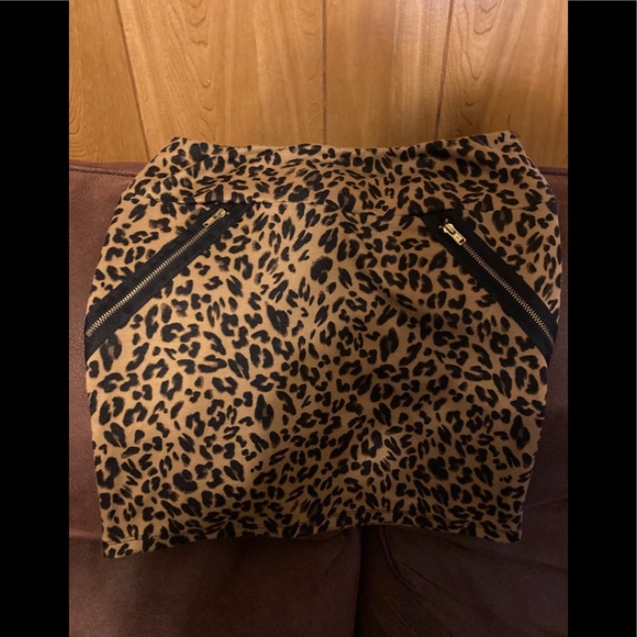 Cute leopard mini skirt. Stretchy. Faux zipper pockets. Very soft. Accentuates figure.