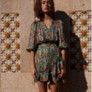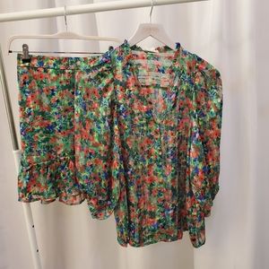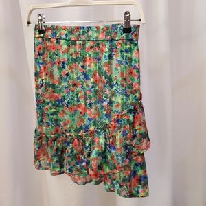 Floral print mini skirt with ruffle detail from Parisienne brand Grace and Mila. Print is on a burnout stripe fabric. 100% Polyester. Elastic back, side zip. Can be worn with matching top "Elodie".