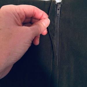 Dark Olive Skirt Size 7. Only worn a few times. Like new. Always been dry cleaned. But, does not have to be. Smoke free home. Has a small side slit on one side and back zipper. Short.