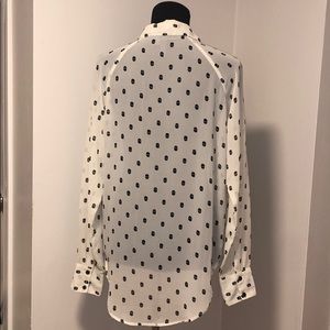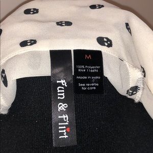 Sheer white button down blouse with small heart-eyed skulls. Longer in the back. Black and gold buttons. Gently worn.
